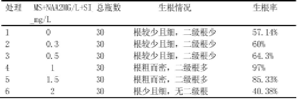 按生根情况来看,以MS+NAA 2mg/L+Si1mg/L的生根最好,具体情况如下表