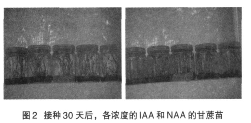 从表2可以看出IAA对甘蔗生根有一定的影响,随着IAA浓度的增加,甘蔗的生根效果越来越好,到2mg/L时生根最好:根浓而密,较粗壮;苗墨绿;黄叶基本没有。以后随着IAA浓度的增加,甘蔗的生根效果越来越差。